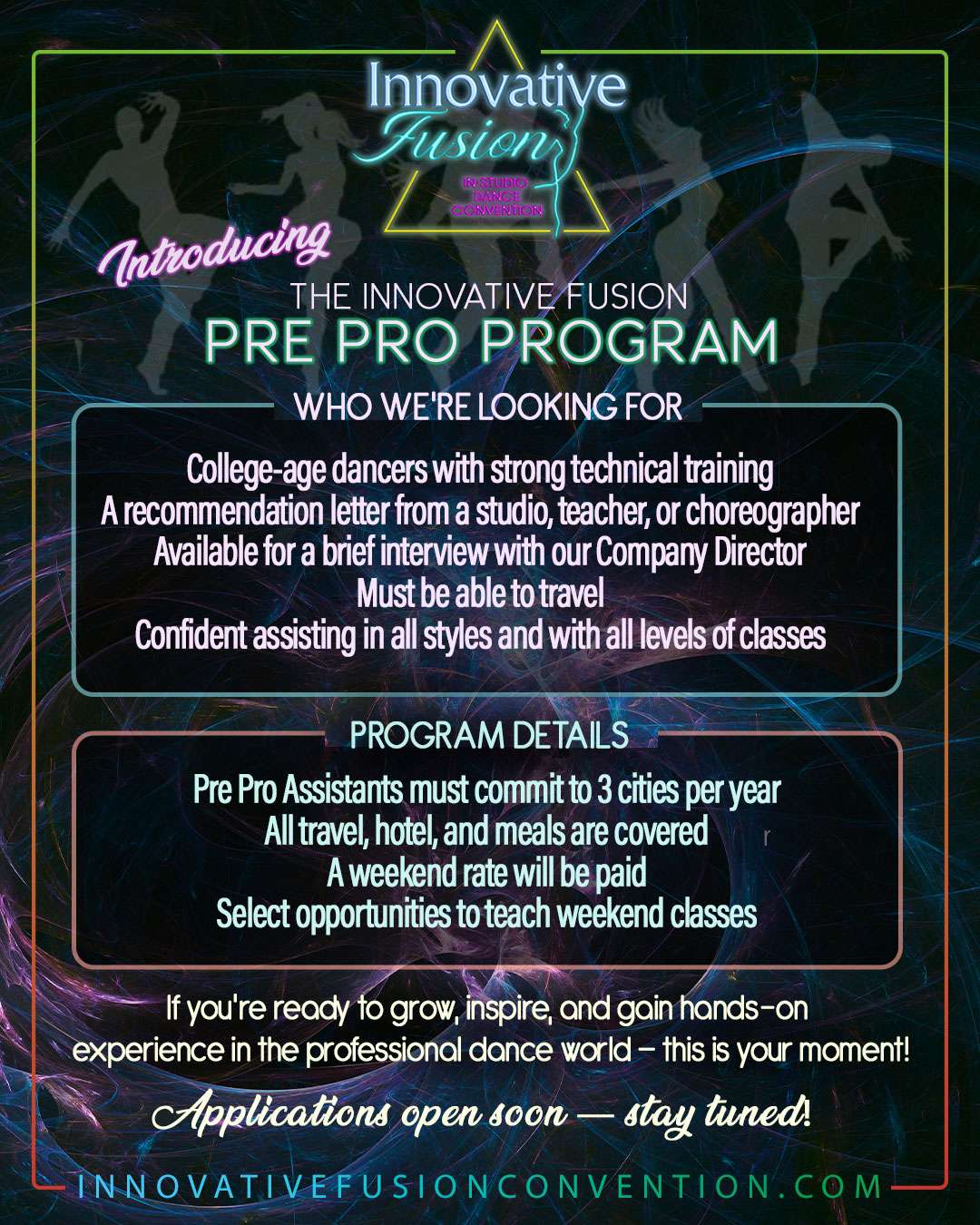 We handle everything! You pick a weekend that works best for your studio, choose your faculty, then we book the faculty, hotels and transportation so all you have to do is sit back and relax while enjoying the Innovative Fusion experience for you and your students!